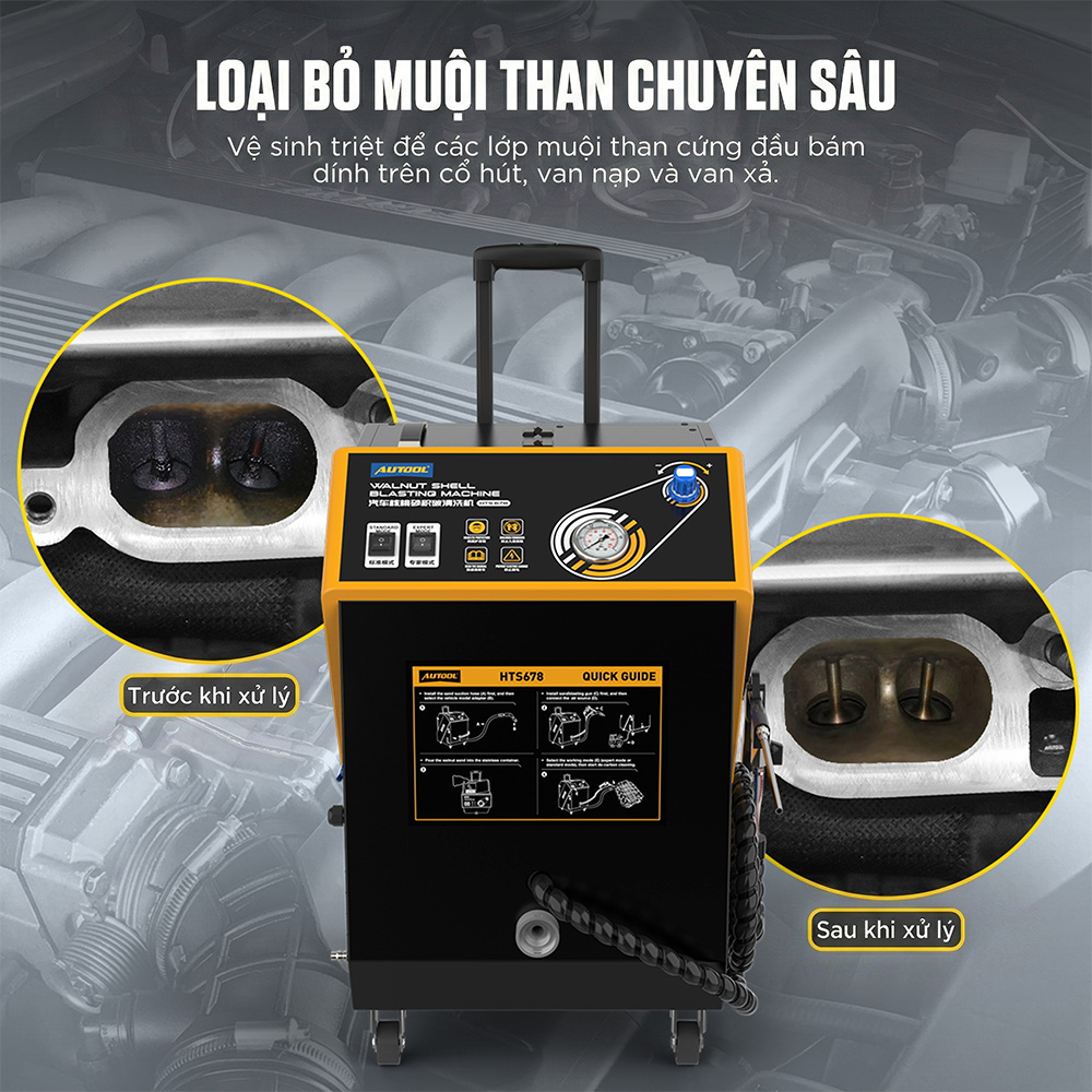 Để cung cấp một giải pháp làm sạch dứt điểm, an toàn và chuyên nghiệp nhất, Máy bắn trấu vệ sinh họng nạp bằng vỏ hạt óc chó AUTOOL HTS678 đã chính thức được giới thiệu. Là phiên bản hiệu suất cao với motor hút lên tới 1800W, thiết bị này sử dụng luồng khí nén tốc độ cao để phun hạt vỏ quả óc chó tự nhiên, đập tan mọi mảng bám cứng đầu chỉ trong vài phút mà không cần rã máy. Đặc biệt, với bộ 23 đầu nối (adapter) đa năng đi kèm và khả năng điều chỉnh áp suất linh hoạt, AUTOOL HTS678 tự tin chinh phục mọi dòng xe từ phổ thông đến xe sang, mang lại lợi nhuận vượt trội cho các trung tâm dịch vụ ô tô.