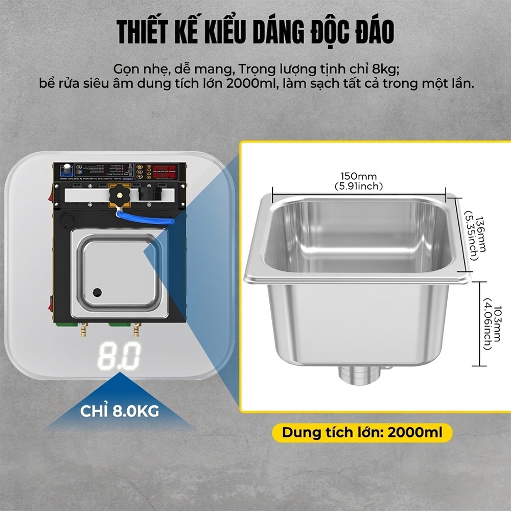 Dung tích bể siêu âm2000 ml (Kích thước: 150 x 136 x 103 mm)