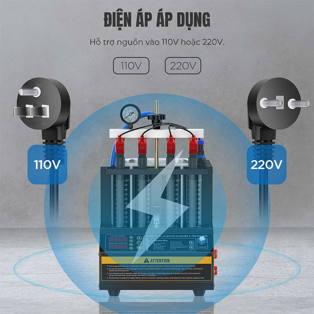 • Quy trình chuẩn: Rửa sạch đất cát bên ngoài kim > Thả vào bể siêu âm (không để dung dịch ngập qua giắc cắm điện) > Cắm cáp xung và bật gia nhiệt > Ngâm và siêu âm > Lấy ra gắn lên giá bơm > Bơm cồn test rò rỉ, test dạng tia và đo lưu lượng cân bằng trên 4 ống thủy tinh > Xả cạn dung dịch khỏi máy sau khi sử dụng để bảo vệ tuổi thọ bơm.