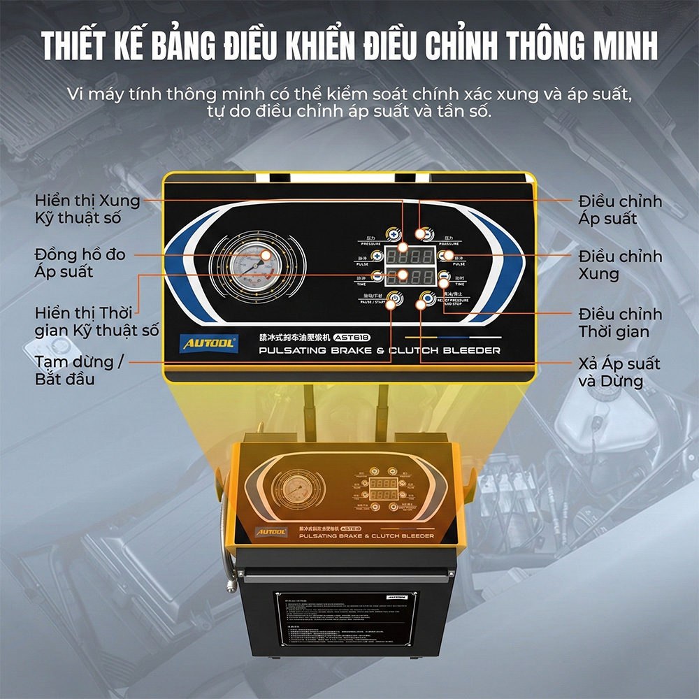 Kỹ thuật viên có thể cài đặt và kiểm soát chính xác 3 thông số cốt lõi: Thời gian hoạt động, Tần số xung nhịp và Áp lực bơm (dao động từ 0.6 đến 3.0 bar). Sự linh hoạt này giúp máy tương thích hoàn hảo với độ chịu tải của từng hệ thống phanh cũ hoặc mới, tránh làm bục phớt cao su.