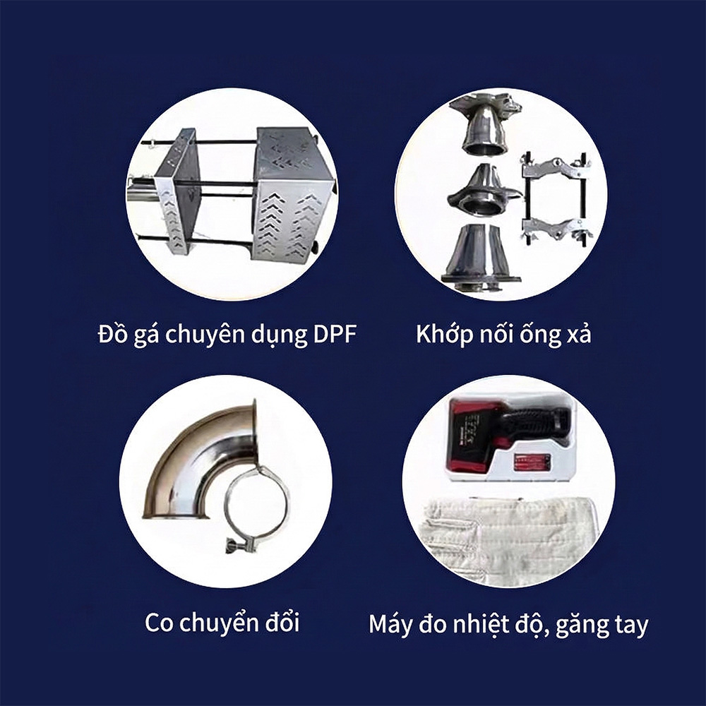 Phụ kiện chuyên nghiệp, linh hoạt: Để kết nối vừa vặn với mọi loại bầu DPF hình dáng kỳ dị của hàng trăm dòng xe khác nhau, máy đi kèm trọn bộ đồ nghề cực chất: Đồ gá kẹp chuyên dụng, đa dạng các loại đầu nối ống xả, cút nối góc chuyển đổi / Ống cong chuyển đổi.
